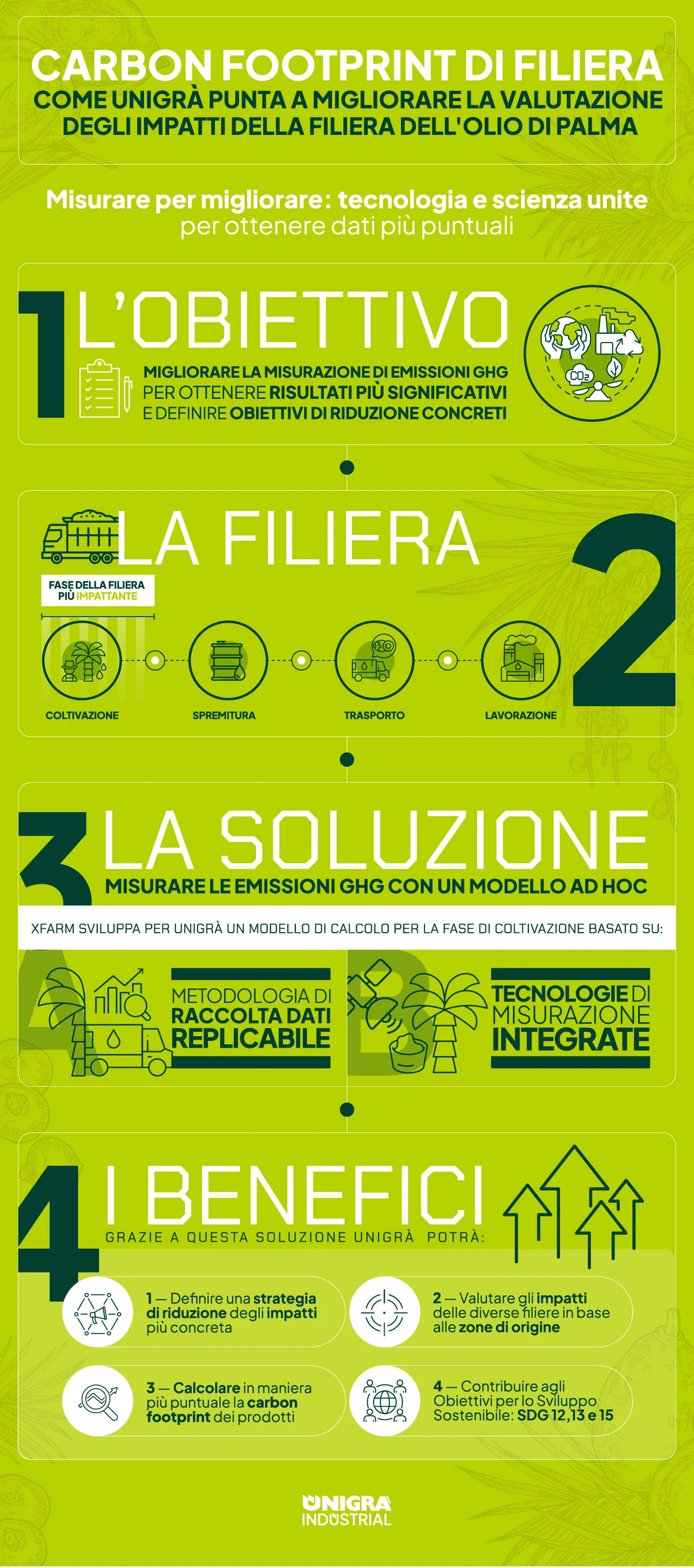 Non si può migliorare ciò che non si misura: solo calcolando in modo accurato il proprio impatto è possibile fissare obiettivi concreti e individuare le soluzioni più efficaci per raggiungerli. Da qui parte il nuovo progetto con cui Unigrà intende misurare le emissioni di CO₂ nella sua filiera dell’olio di palma.